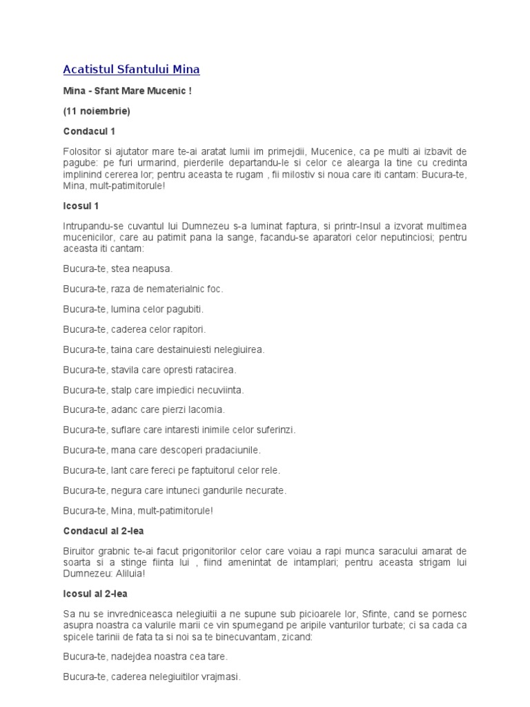 Academia edu is a platform for academics to share research papers. Slava tie dumnezeul nostru slava tie. Acatistul sfantului mare mucenic mina. Pe furi urmarind pierderile departandu le si celor ce alearga la tine cu credinta implinind cererea lor.