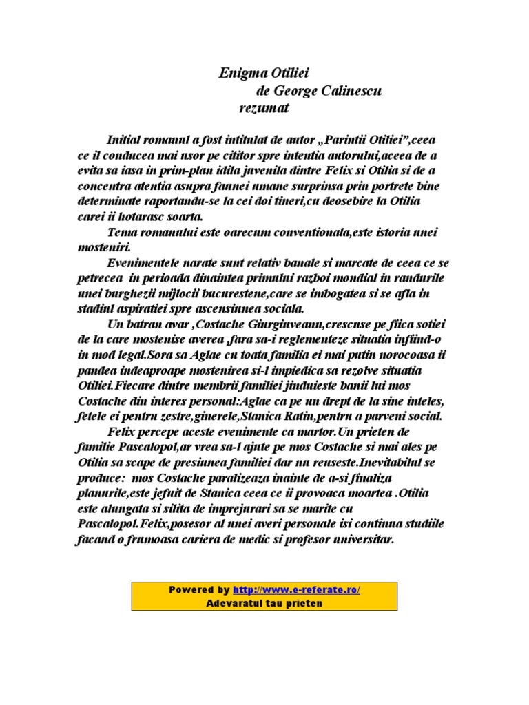Enigma otiliei de g. Romanul prezinta viata burgheziei bucurestene din prima jumatate a secolului nostru. Verisoara lui otilia o tanara de aceeasi varsta cu el il primeste cu multa caldura si il conduce pe baiat intr o camera unde restul familiei juca table. Referat despre enigma otiliei rezumat pe capitole otilia il intampina luandu l de brat pentru prima data este prins cu asemenea familiaritate fata este subtirica cu o rochie stransa pe solduri intra intr o odaie plina cu fum si face cunostinta cu pascalopol un barbat de aproape cincizeci de ani aglae sora batranului de pe scari are cam aceeasi varsta cu pascalopol si il examineaza pe baiat.