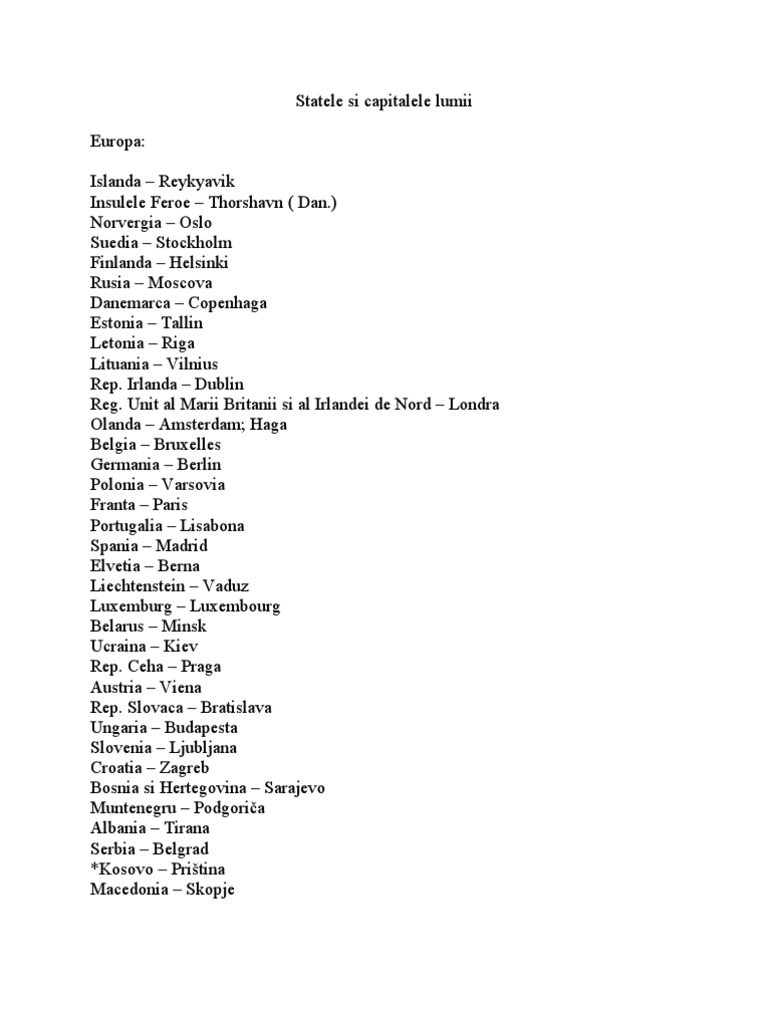 Tarile si capitalele europei berna 11 elveţia berna 12 estonia tallinn. 1 anglia londra 2 austria viena 3 belarus minsk 4 belgia bruxelles 5 bosnia herţegovina. Aceasta este lista capitalelor europene ordonată după suprafața lor în km 2. Albania capitala tirana andorra capitala andorra la vella.