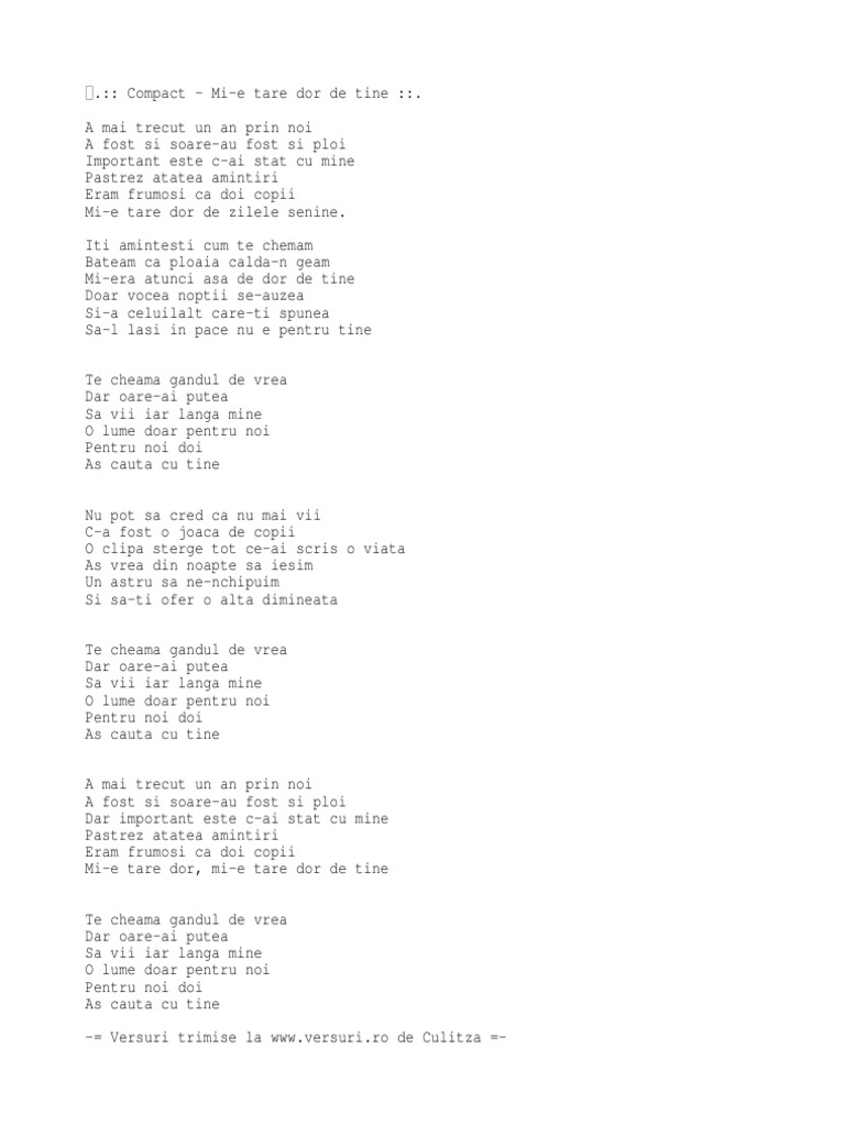 Mi e tare dor de tine versuri. Compact mi e tare dor de tine a mai trecut un an din noi a fost si soare au fost si ploi important este c ai stat cu mine. As vrea sa stiu cat de mult ma doresti mi e dor de chipul tau mi e tare dor de tine de tine de tine storfa 1. Versuri mi e tare dor de tine de compact. Pastrez atatea amintiri eram.