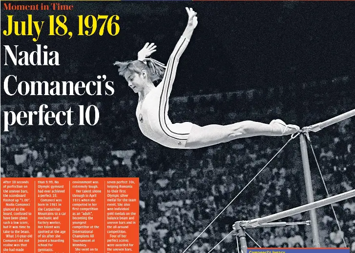 Comaneci then a 14 year old romanian girl with a ribbon tied in her hair stole the show at the montreal games when she became the first gymnast to score a perfect 10 at an olympics.