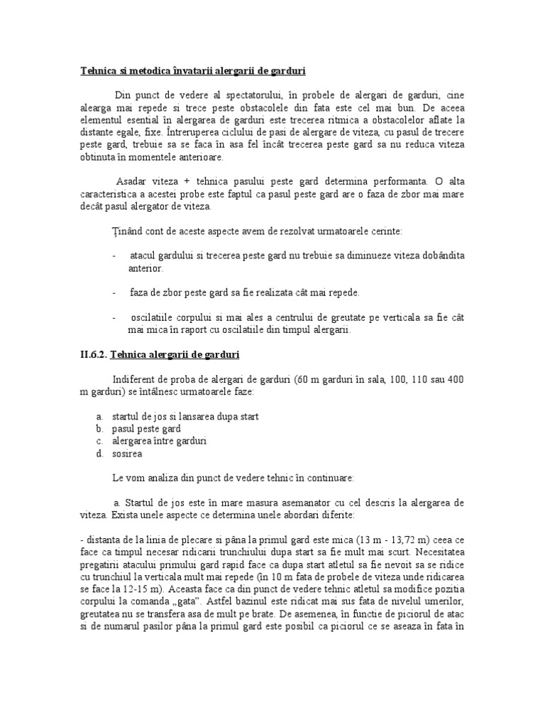 Arhiva contine 1 fisier doc de 10 pagini. Acest referat descrie tehnica probei de alergare de garduri. Alergarea este un tip de mers caracterizat printr o fază aeriană în care toate picioarele se află deasupra solului deși există și excepții acest lucru este în contrast cu mersul în care un picior este mereu în contact cu solul picioarele sunt ținute cel mai. Acest referat descrie atletism.