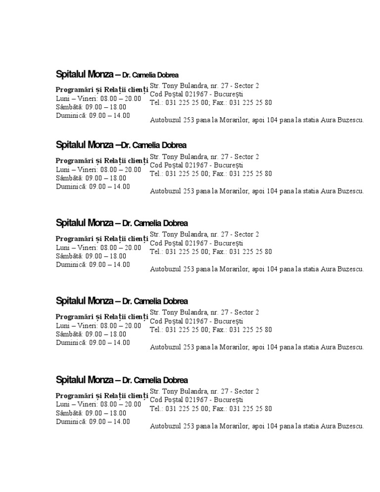 40310050823 spitalul monza str. Facem călătoritul către strada tony bulandra 27 mai ușor acesta fiind motivul de ce peste 865 milioane de utilizatori inclusiv utilizatorii din bucuresti au încredere în moovit ca cea mai bună aplicație de transport public. 27 sector 2 monza metropolitan hospital calea șerban vodă nr. 27 sector 2 bucharest 021967 brain institute este un centru specializat în neurochirurgie dezvoltat în parteneriat cu spitalul monza.