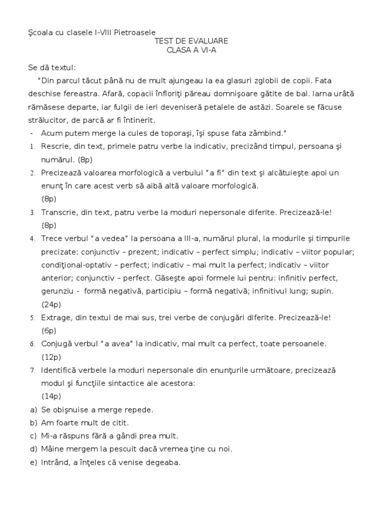 Test de evaluare iniial disciplina matematic anul colar 2011 2012 clasa a vi a pentru rezolvarea corect a tuturor cerinelor. Vreau sa fac testul. învăţământ gimnazial limba şi literatura română teste clasa a 6 a. Transcrie integral o propoziţie dezvoltată din text.